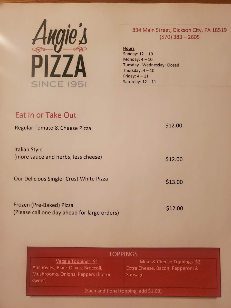 Welcome to Angie's Pizza Dickson City, a cherished gem located at 834 Main St, Dickson City, PA. Renowned for its legendary Mid-Valley style pizza, Angie's seamlessly blends tradition with modern flair, thanks to a recent remodel that has revitalized its cozy atmosphere. The menu highlights include a uniquely crafted pizza with American cheese seamlessly melded into the sauce, providing an unparalleled taste experience that keeps customers returning for more.